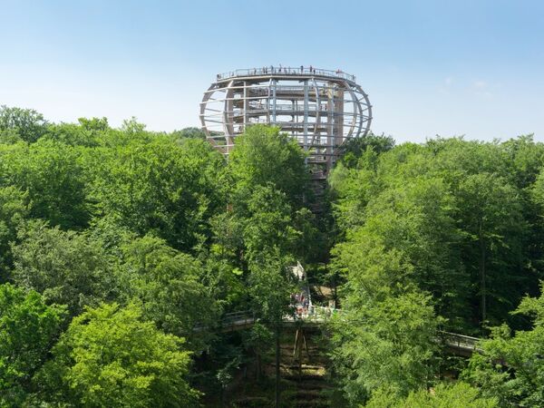 Auf Augenhöhe mit dem Buchenwald genießt man von der Aussichtsplattform den beeindruckenden Blick über die Bodden, das Hügelland und die Wälder. Unterwegs vermitteln Erlebnisstationen spannendes Wissen über die Tier- und Pflanzenwelt der Insel Rügen.