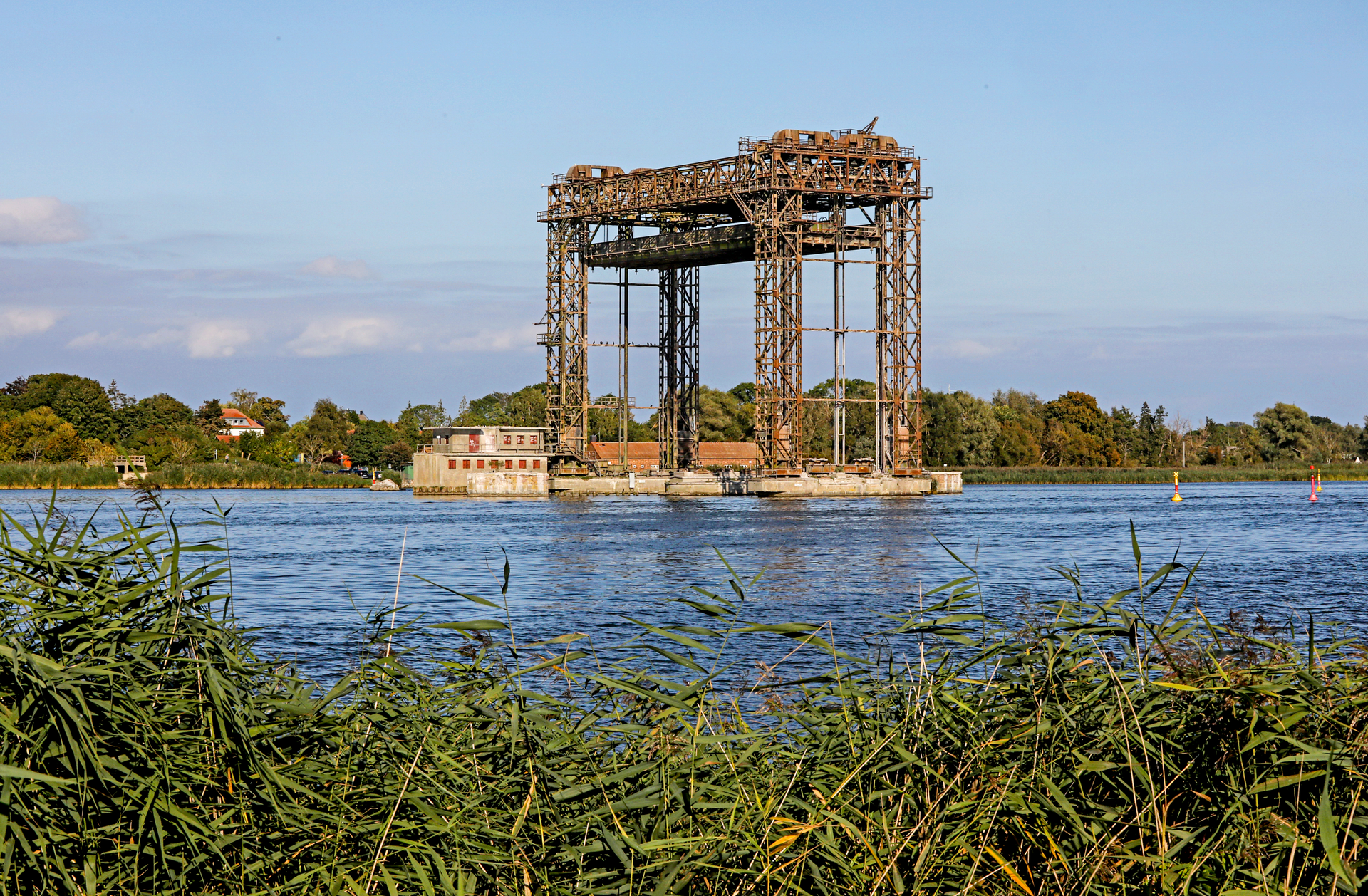 Die Eisenbahnhubbrücke war zur Einweihung im Jahre 1933 die Modernste in Europa. Die festen Überbauten wurden 1945 gesprengt.