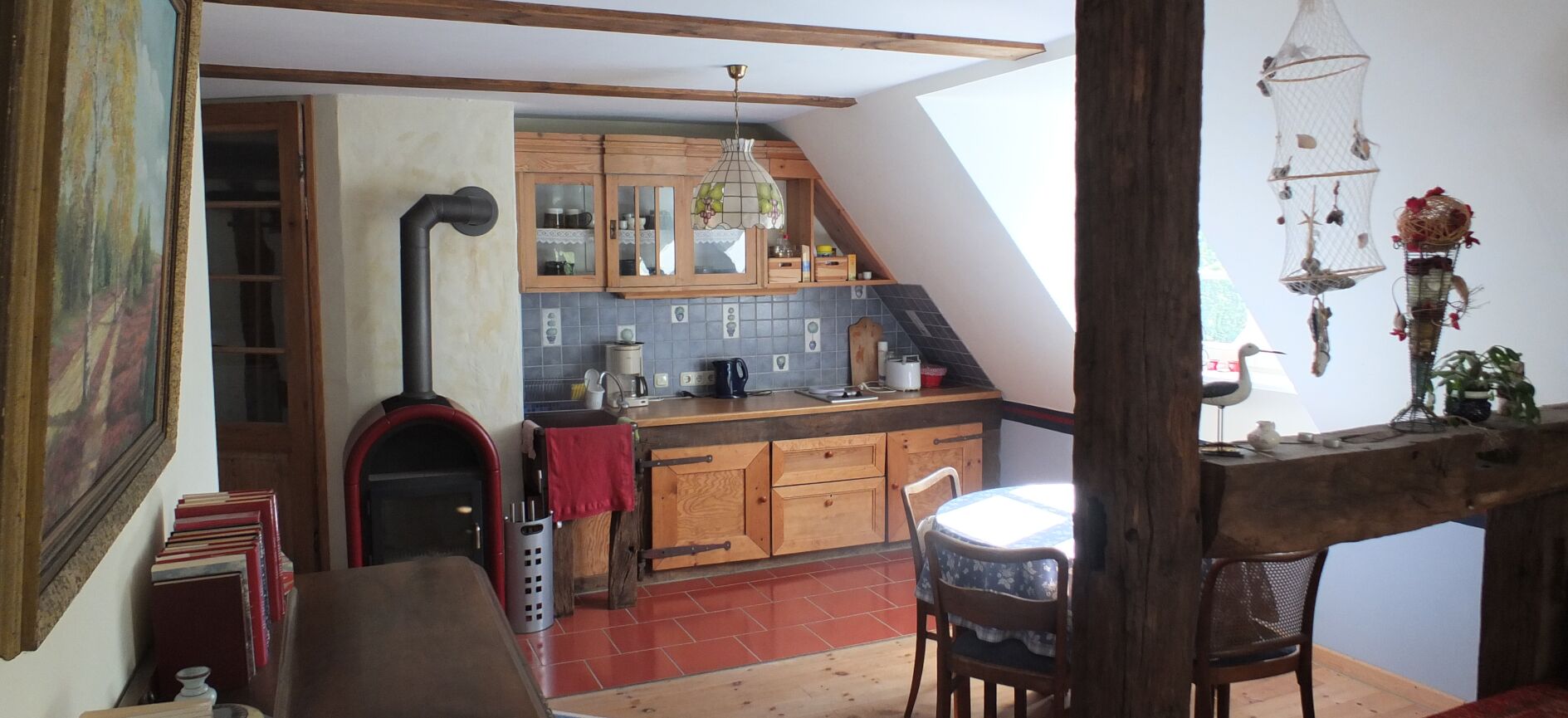 - Kuscheleck: Das Appartement befindet sich im Obergeschoss des Hauses, es besteht aus einem Wohn-/Schlafzimmer mit Doppelbett (1,40m breit), integrierter Teeküche, einem großen Duschbad sowie Flur mit Garderobe.