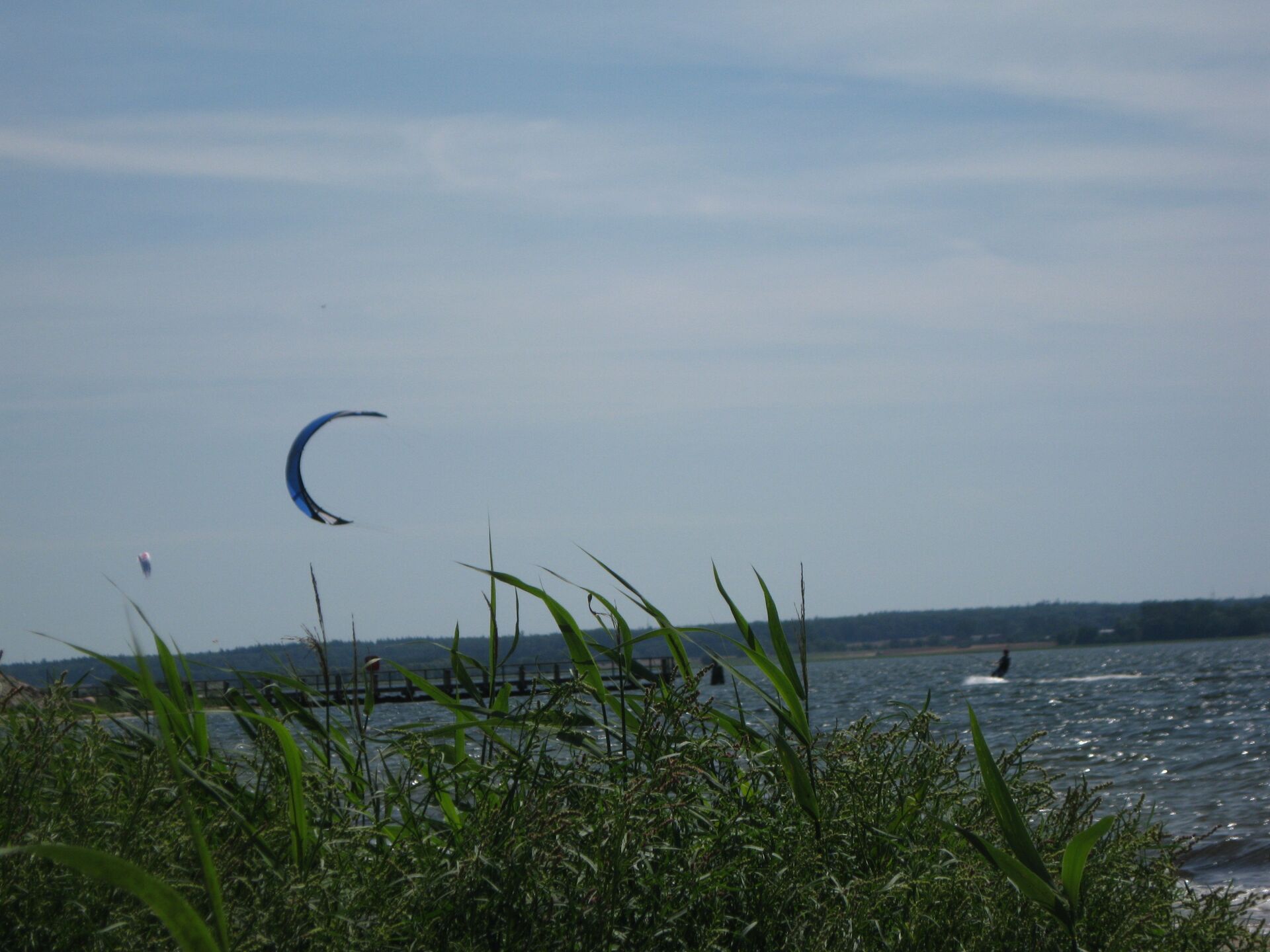 Der Strand ist sehr schön mit viel Sand und teilweisem Grasbewuchs. Von hier hat man einen herrlichen Blick über den Bodden auf die Silhouette Greifswalds und den Hafen.