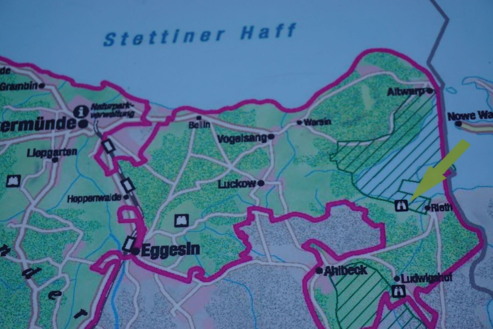 Auf dem Oder-Neiße Radweg kommend von Rieth nach Ueckermünde fährt man entlang des Neuwarper See. Auf dem großen Aussichtsturm hat man einen wunderbaren Blick auf den See und den Riether Werder. Der Neuwarper See und der Riether Werder sind Bestandteil des Naturparks Am Stettiner Haff.