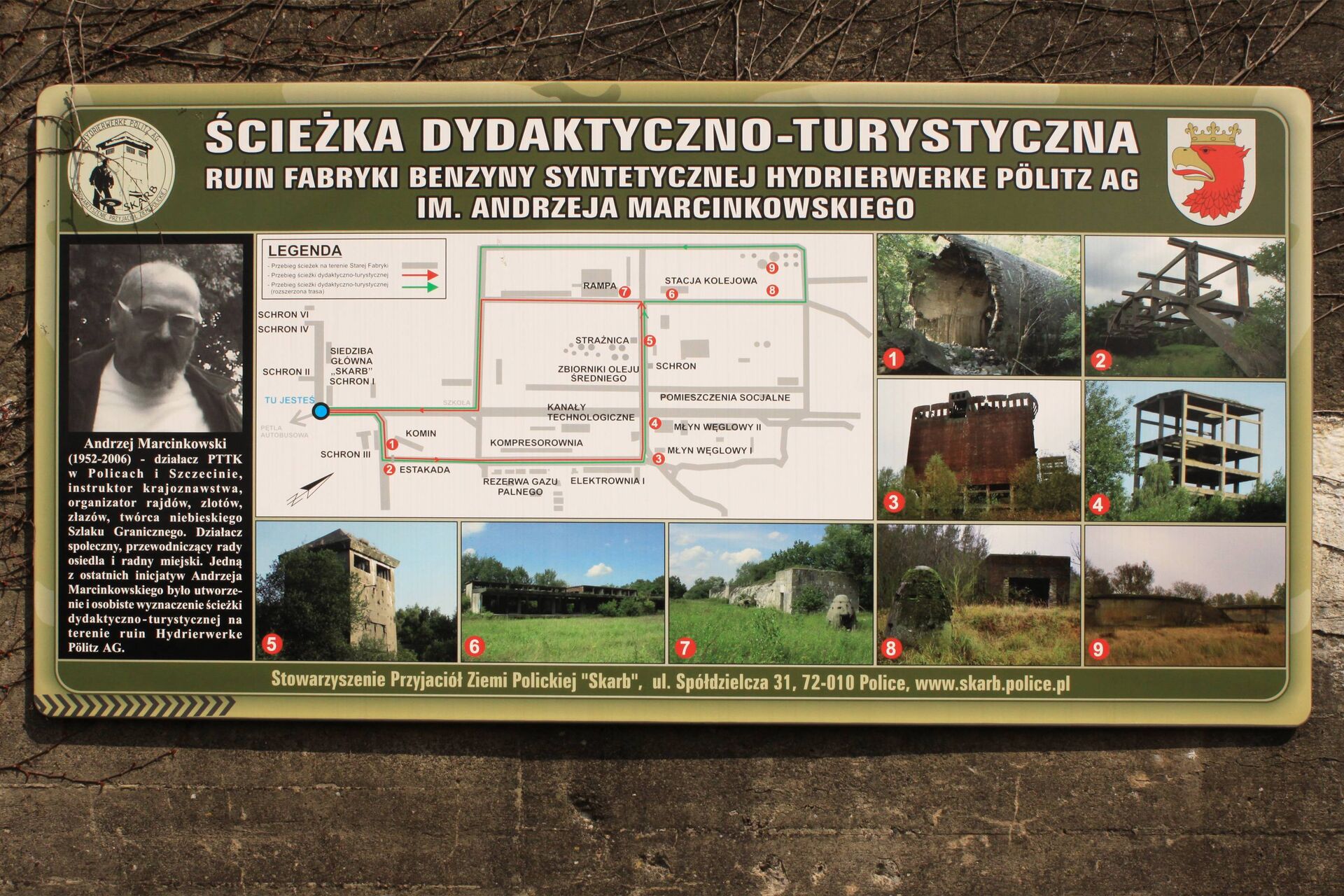 Die Hydrierwerke Pölitz entstanden 1938. Hier wurde für die Wehrmacht aus Kohle synthetisch ein Ottokraftstoff hydriert. 1944 umfasste das Werk eine Fläche von 1500 Hektar, wobei etwa 200 Hektar bebaut waren. Von dieser Bebauung haben sich bis heute verschiedene Gebäude in unterschiedlichstem Zustand erhalten. Dominant ist das ehemalige Kohlhebewerk, das den Halbfabrikaten vorbehalten war. Sichtbar ist auch das Stahlskelett des Kraftstoffbrenners. Auch Luftschutzbunker und Splitterschutzzellen, mit ihrer eiförmigen Gestalt schützten sie eine Person, sowie Westermänner mit typischer Betonspitze blieben erhalten. Wie alles andere finden sich auch Silos, also Benzintanks in dem dicht mit Sträuchern und Büschen überwucherten Areal. Der Zugang ist schwierig und gefährlich, hier liegen überall ungeräumte Trümmer und Metallteile ragen aus dem Boden, weshalb von einer ungeführten Tour über das Gelände nur abgeraten werden kann. An jedem Samstag um 13:00 Uhr hingegen startet eine kostenlose Führung, auf der man die Fabrik, sowie Teile der unterirdischen Anlagen und natürlich das Museum, den Sitz des Vereins besichtigen kann.