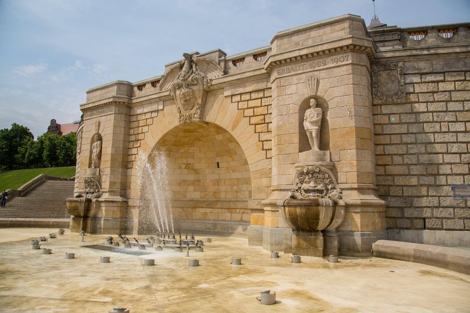 In den Jahren 1902-1907 entstanden Pavillons auf den Terrassen und Treppen. An den Wänden befinden sich Tafeln mit Motiven der Meeresfauna und -flora sowie die Wappen von Szczecin und anderen Küstenstädten. An der Spitze der Terrassen wurde ein von Bäumen gesäumter Spazierweg angelegt, im mittleren Teil wurde eine kleinere halbrunde Terrasse etwas tiefer gebaut. In seiner Mitte steht eine Skulptur von Ludvig Manzl, die den Kampf zwischen einem Menschen und einem Zentauren darstellt. Darunter befindet sich ein großer Brunnen, vor dem zwei Laternen gebaut wurden, die als Leuchttürme stilisiert sind.