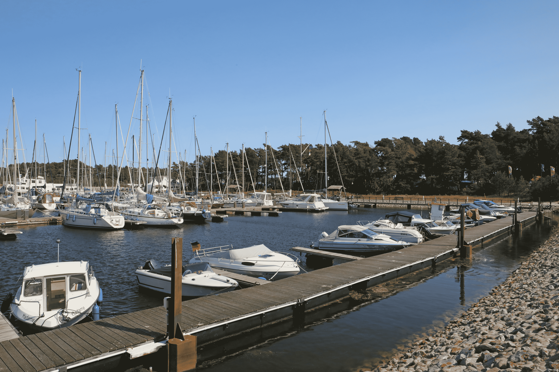 Insgesamt stehen 180 Liegeplätze zur Verfügung. Außerdem gibt es am Hafen eine Tankstelle (Diesel), verschiedene Schwimmsteganlagen (als Stahlkonstruktion und aus Beton), Versorgungssäulen mit Wasser, Strom und Beleuchtung, einen Internetzugang über Hotspot, sowie einen Fahrradverleih, Parkplätze und einen umfangreichen Yachtservice.
