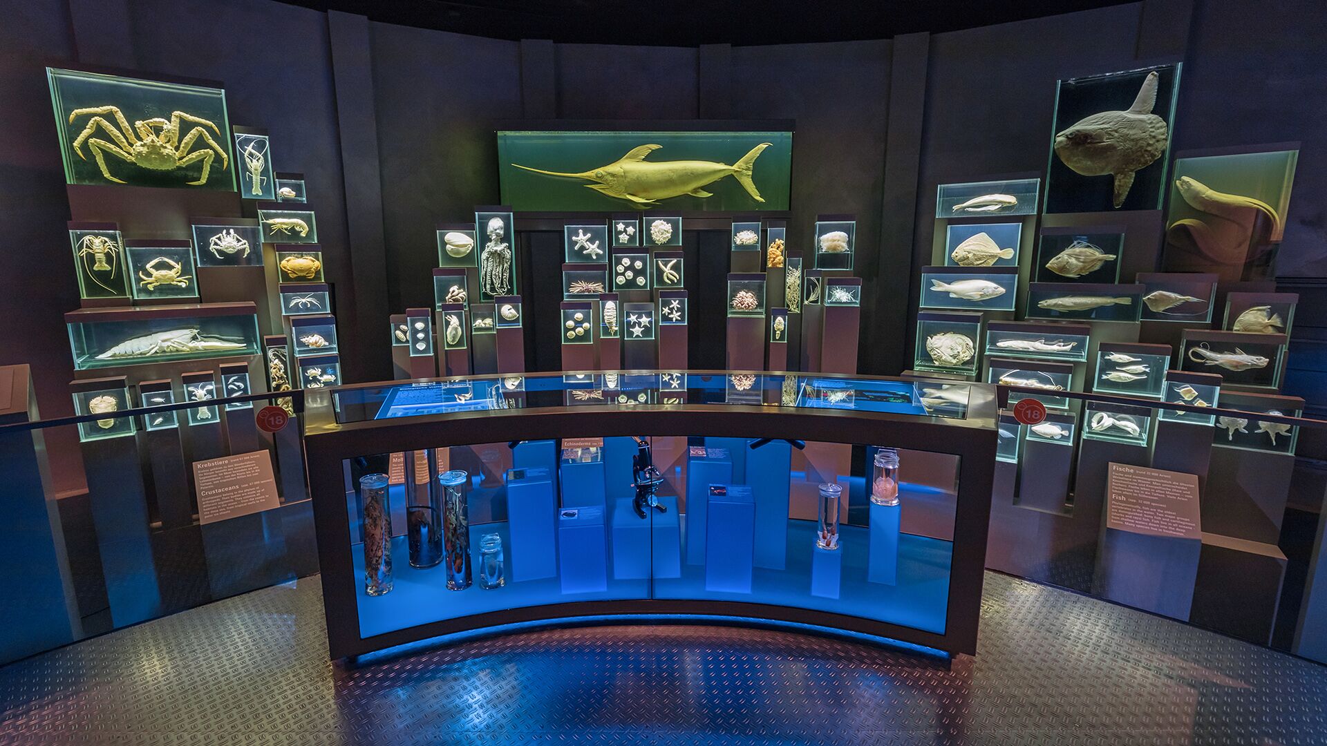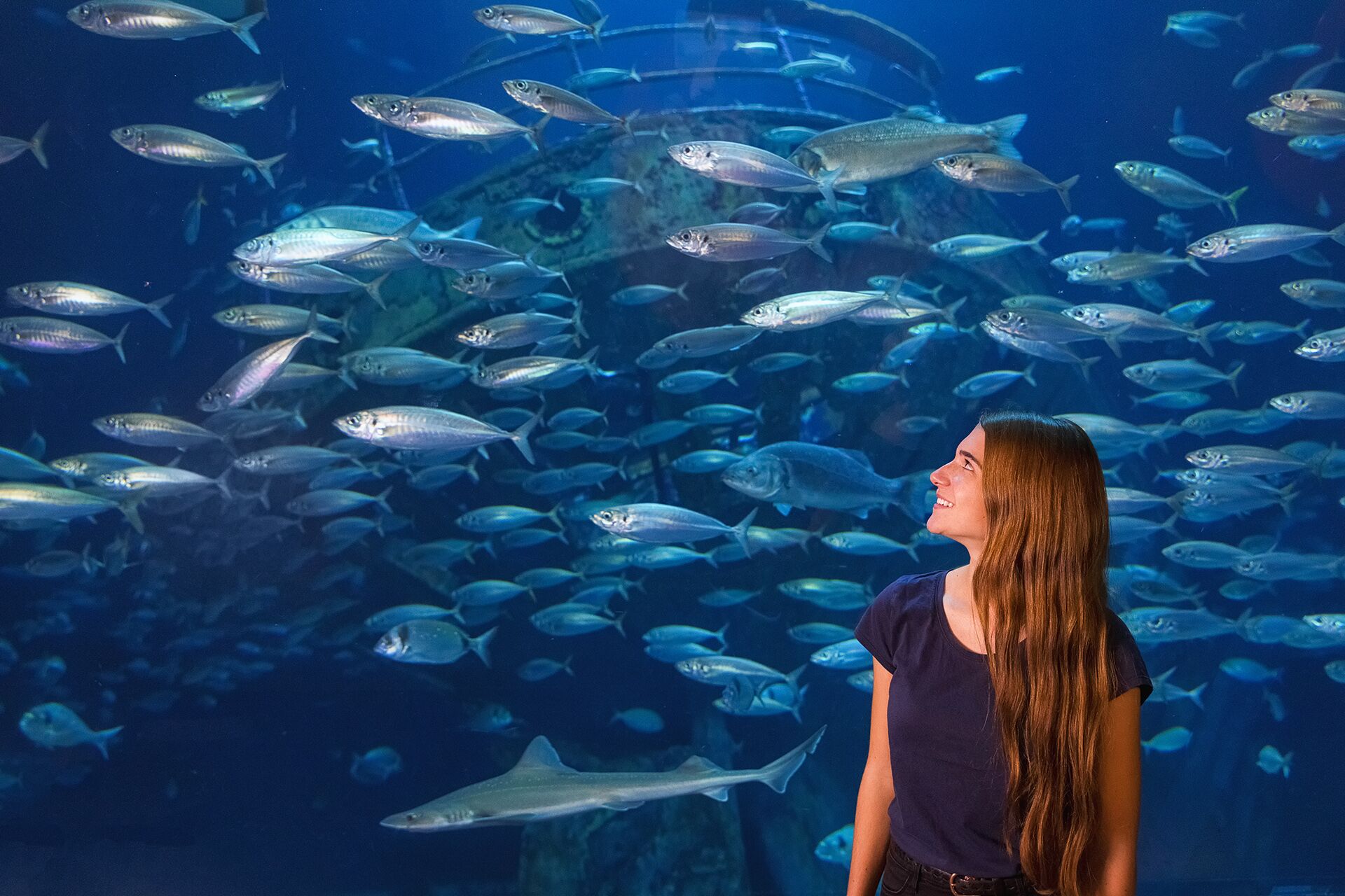 Einzigartig ist die thematische Route durch die nördlichen Meere mit 50, teils riesigen Aquarien. Die beiden Acrylscheiben bieten auf zwei Ebenen über 80 Quadratmeter Sichtfläche auf verschiedene Hai- und Rochenarten sowie silbrig-schimmernde Fischschwärme. In Europas größter Ostsee-Ausstellung erwarten die Museumsgäste spannende Einblicke in den Lebensraum von Kegelrobbe, Seeadler oder des winzig kleinen Planktons. Der Insel Helgoland ist ein außergewöhnliches Tunnelaquarium gewidmet, durch das die Besucher*innen hindurchlaufen können.