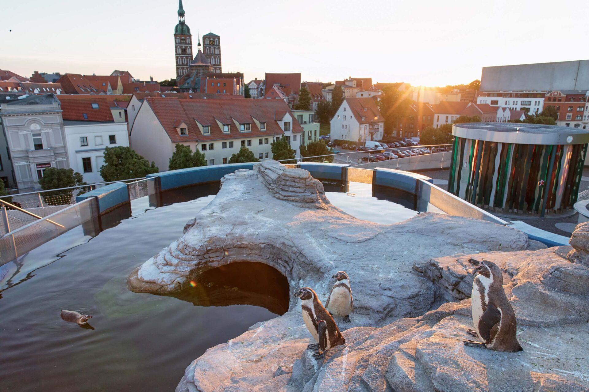 Neben den Ausstellungen lädt der Erlebnisbereich „Meer für Kinder“ in eine Dünenlandschaft mit Leuchtturmrutsche zum Spielen und Verweilen ein. Auf der Dachterrasse befindet sich eine großzügige Pinguinanlage mit Panoramablick auf die Silhouette der UNESCO-Welterbestadt Stralsund.