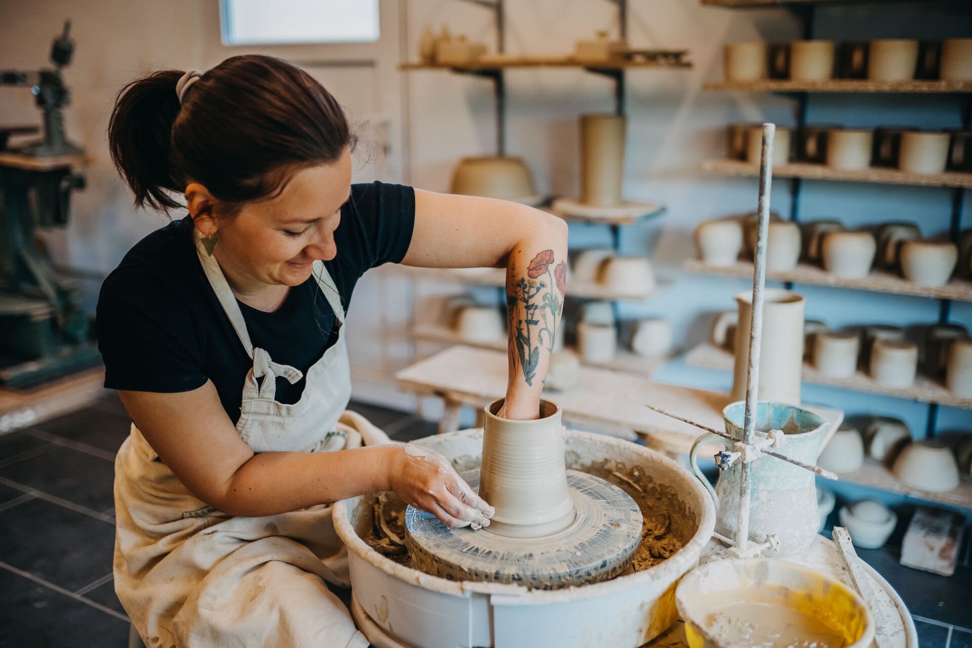 Werfen Sie gerne einen Blick in die Töpferei und sehen Sie typische Werkstattabläufe. Hauptsächlich biete ich Gebrauchsgeschirr an, wie Tassen, Schalen, Teller usw. Doch auch etwas für den Garten werden Sie bei mir finden, wie z.B. Vogeltränken, Kugeln usw.