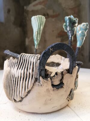 Hinter dem Begriff „Stückwerke“ verbergen sich zum einen Keramiken in ungewöhnlichen Kombinationen und zum anderen Collagen aus den verschiedensten Materialien zu ganz unterschiedlichen Themen. Wie schon in den Jahren zuvor erkundet Ulli Siedl in Projektform ihre innere und äußere Welt. Während im letzten Jahr Malerei auf Keramik getroffen ist, werden in diesem Jahr beide Medien miteinander verbunden - spielerisch und farbenfroh.